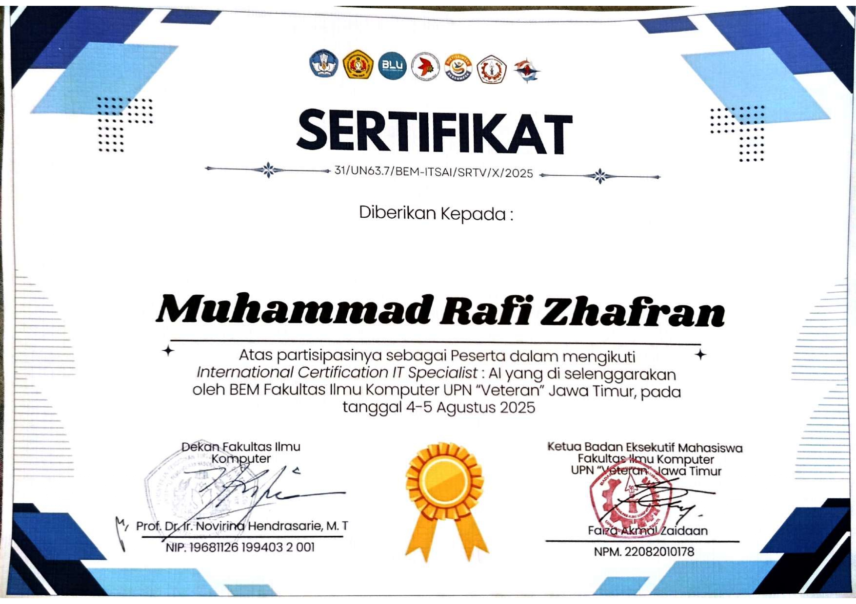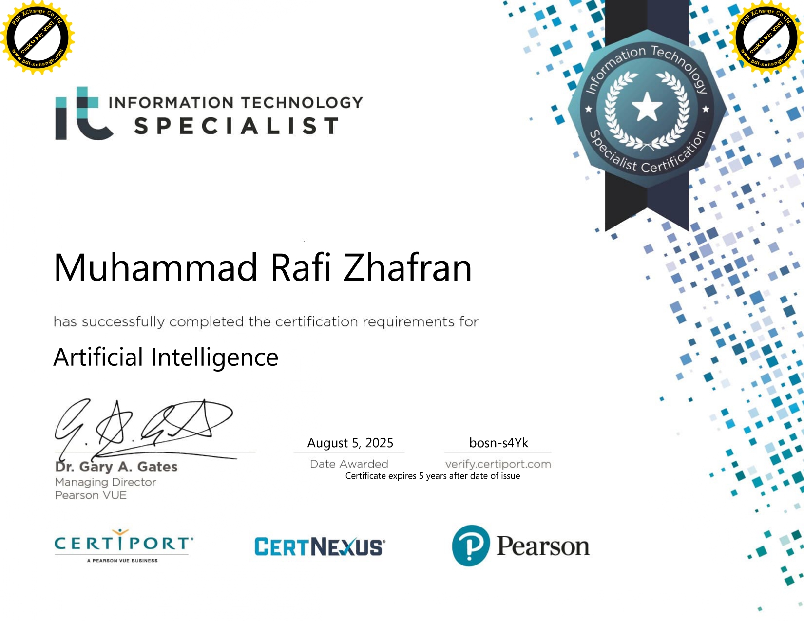 Demonstrated foundational proficiency in artificial intelligence concepts, including data handling, model fundamentals, and ethical AI practices, validated through the Certiport Information Technology Specialist – Artificial Intelligence certification.